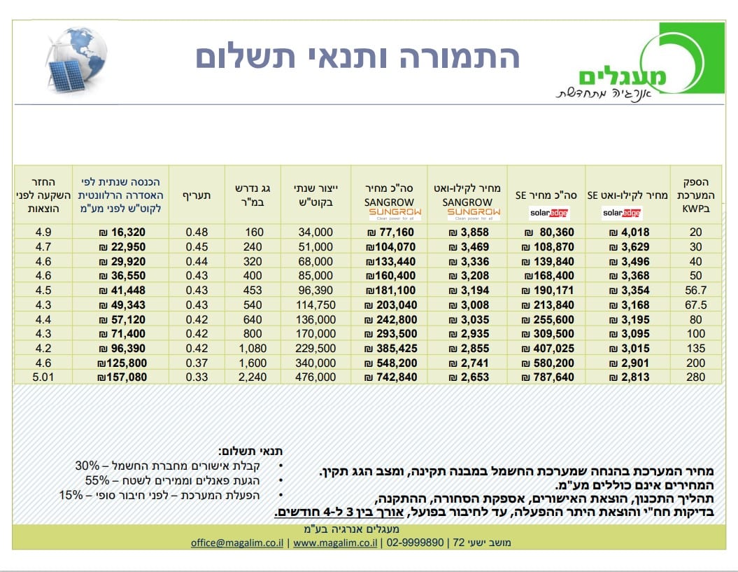 - גודל המערכת: ככל שהמערכת גדולה יותר, כך העלות הראשונית תהיה גבוהה יותר, אך התשואה עשויה להיות גדולה יותר.